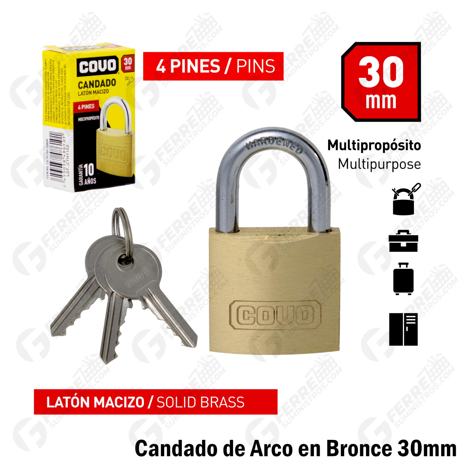 ¡El Candado Compacto con Máxima Resistencia al Clima! El Candado de Arco en Bronce 30mm COVO es la solución de seguridad ideal cuando se requiere un candado pequeño, pero extremadamente resistente a la intemperie. Su construcción de latón macizo y su mecanismo de seguridad lo hacen perfecto para un uso multipropósito donde la resistencia a la corrosión es clave.