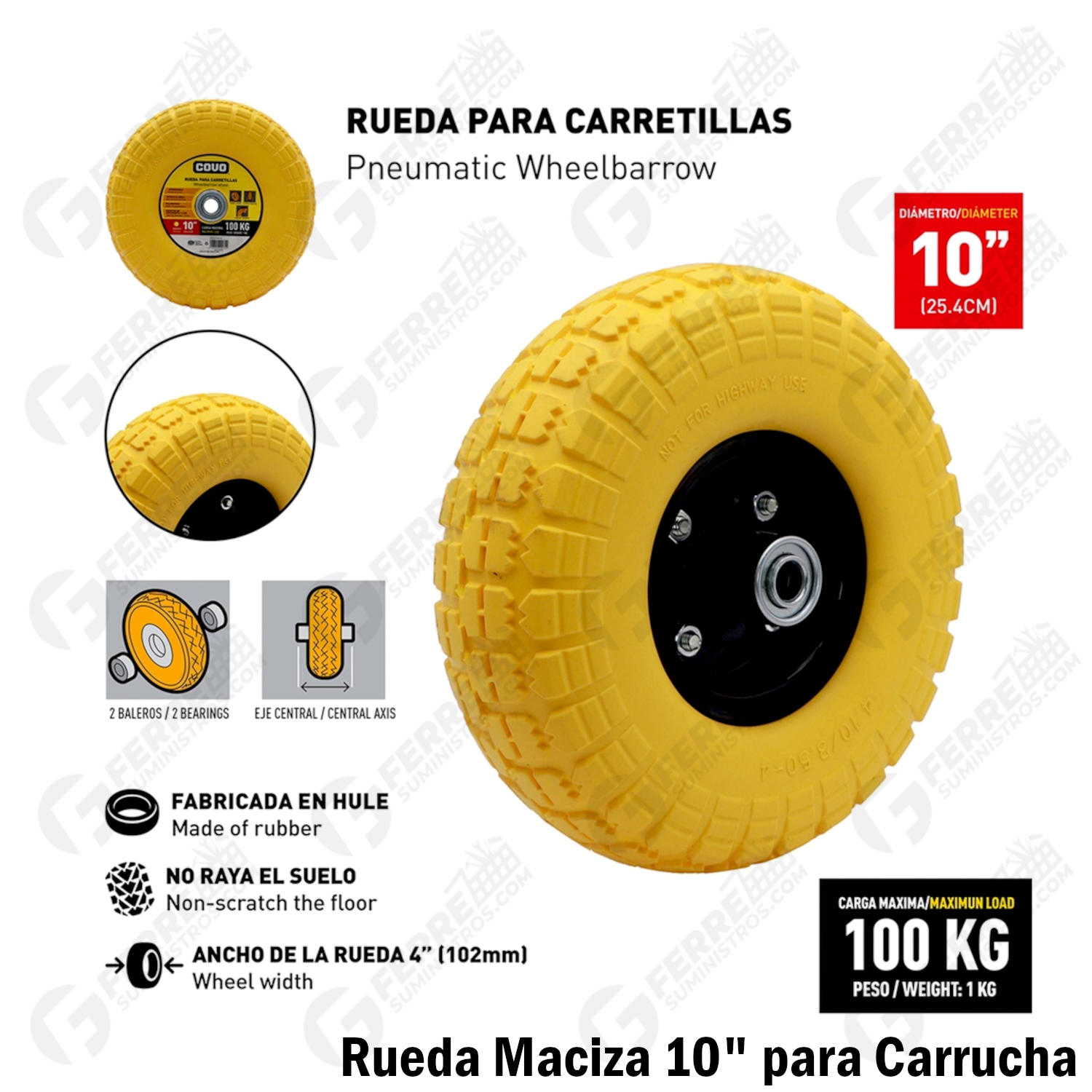 ¡Movilidad Imparable y Sin Mantenimiento para tu Carrucha! La Rueda Maciza de 10″ COVO está diseñada para ofrecer el rendimiento de una rueda neumática sin el riesgo de pinchazos. Fabricada en poliuretano de alta resistencia, esta rueda garantiza la máxima durabilidad y una operación fluida en cualquier superficie, siendo la elección definitiva para tu carrucha o zorra.